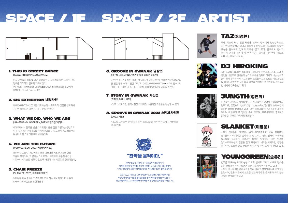 'G.I.G EXHIBITION'은 <2023 G.I.G Festival>과 연계한 전시로서, 스트릿댄스에 대해서 소개하는 전시입니다.